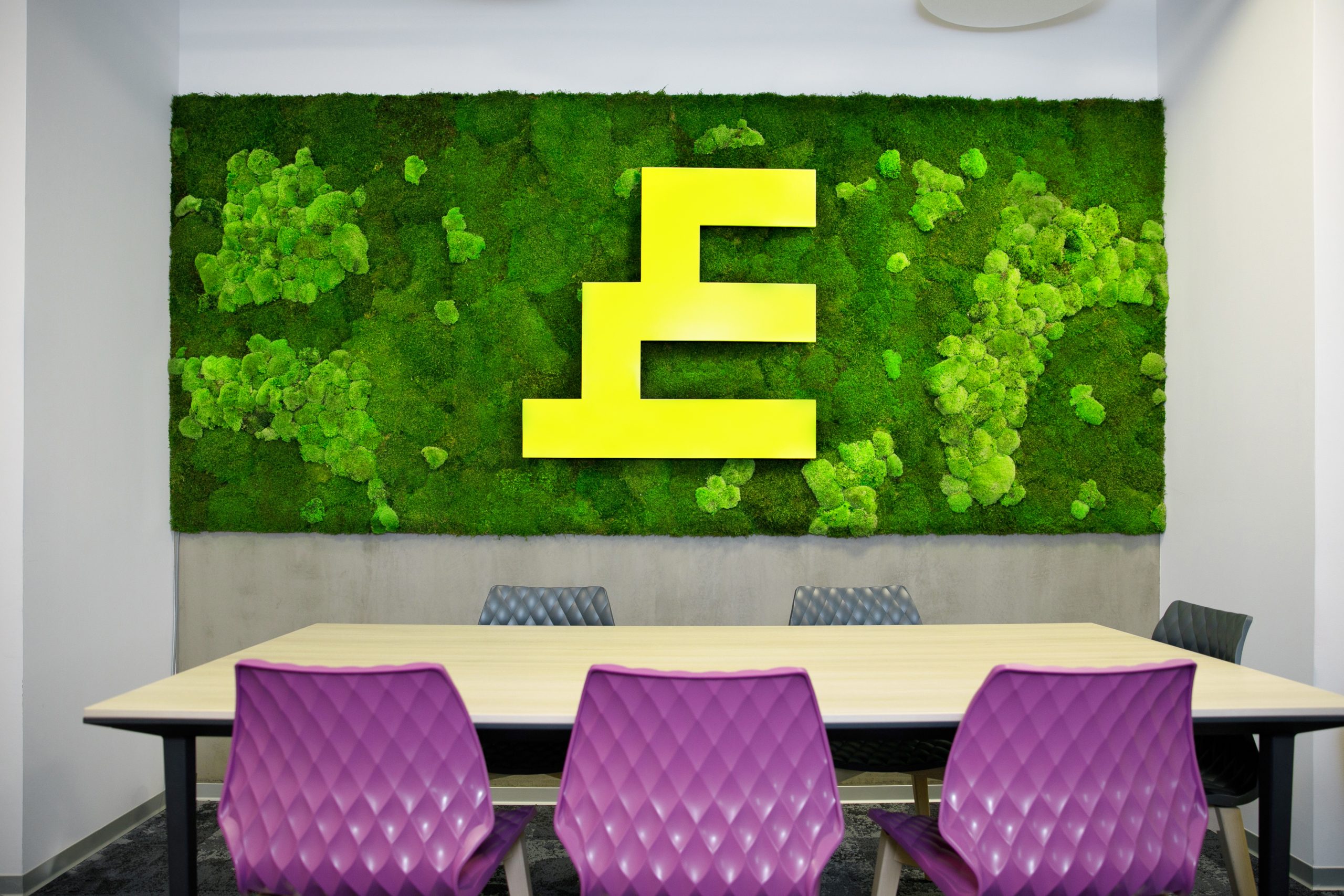 Die Wandgestaltung mit Moos beginnt bewusst oberhalb der Stuhllehnen, um Beschädigungen im täglichen Betrieb auszuschließen – ein Detail, das sowohl gestalterisch als auch funktional relevant ist. Das verwendete Waldmoos und Kugelmoos sorgt für eine ruhige, natürliche Präsenz im Raum, während die pflegefreie Ausführung den hohen Anforderungen dynamischer Office-Umgebungen entgegenkommt.