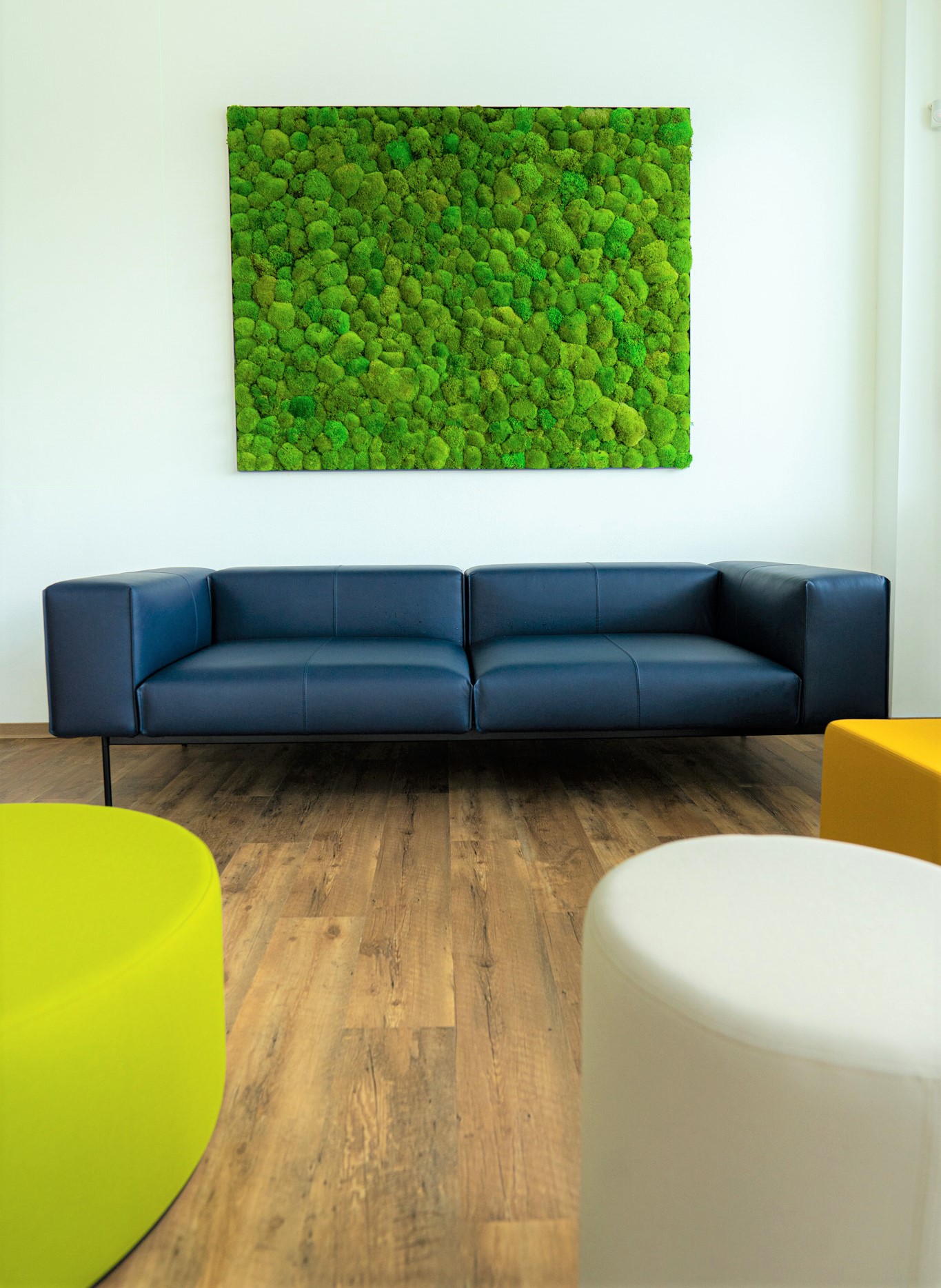 Das Moosbild dient als ruhiger Hintergrund für kurze Pausen, spontane Abstimmungen und informelle Gespräche – Bereiche, die im modernen Office-Alltag bewusst entlastend wirken sollen. Die dreidimensionale Struktur des Kugelmooses bringt Tiefe und Materialität in den Raum, ohne dominant zu wirken, und ergänzt die farbigen Sitzmöbel um einen natürlichen Gegenpol.